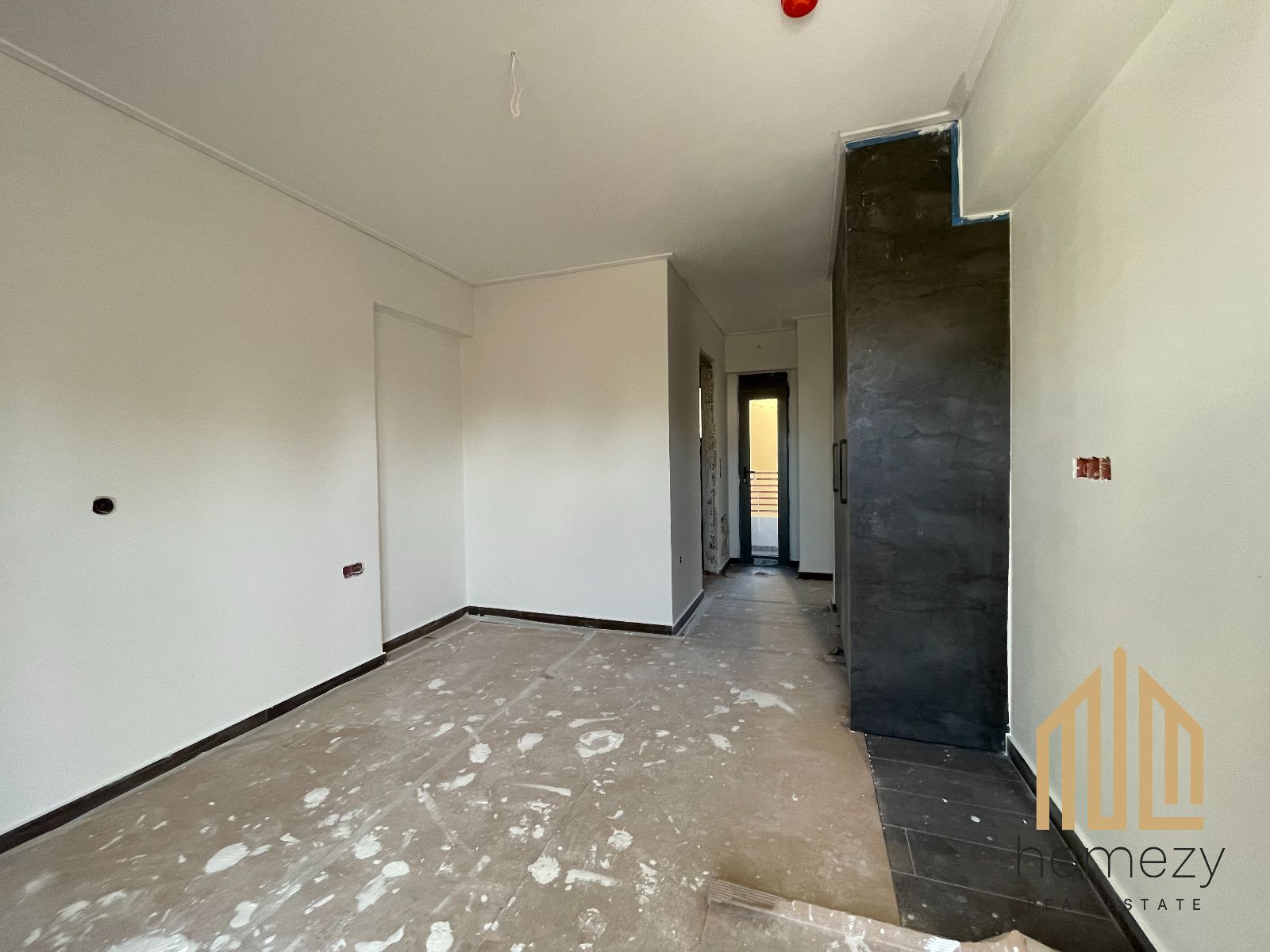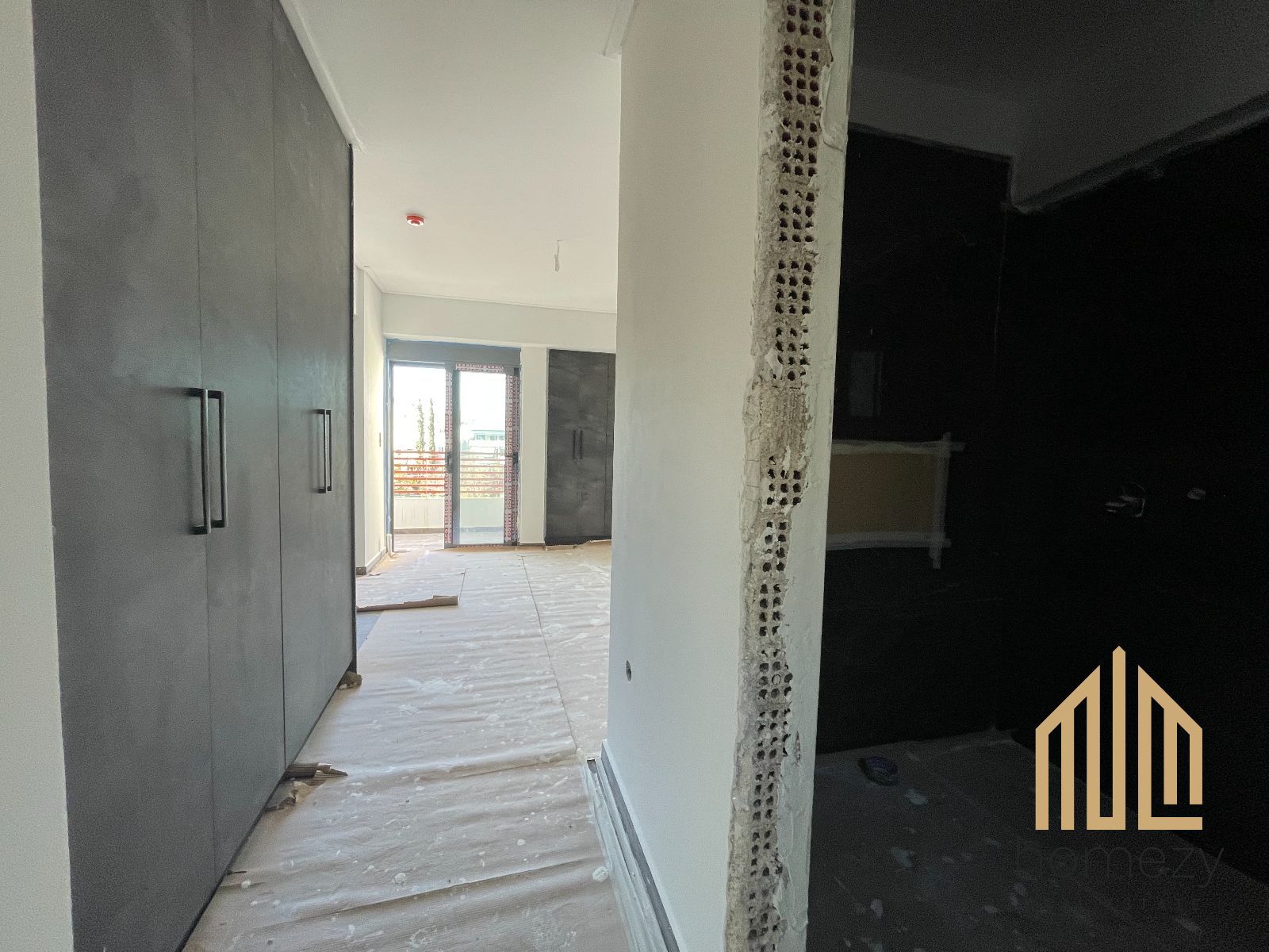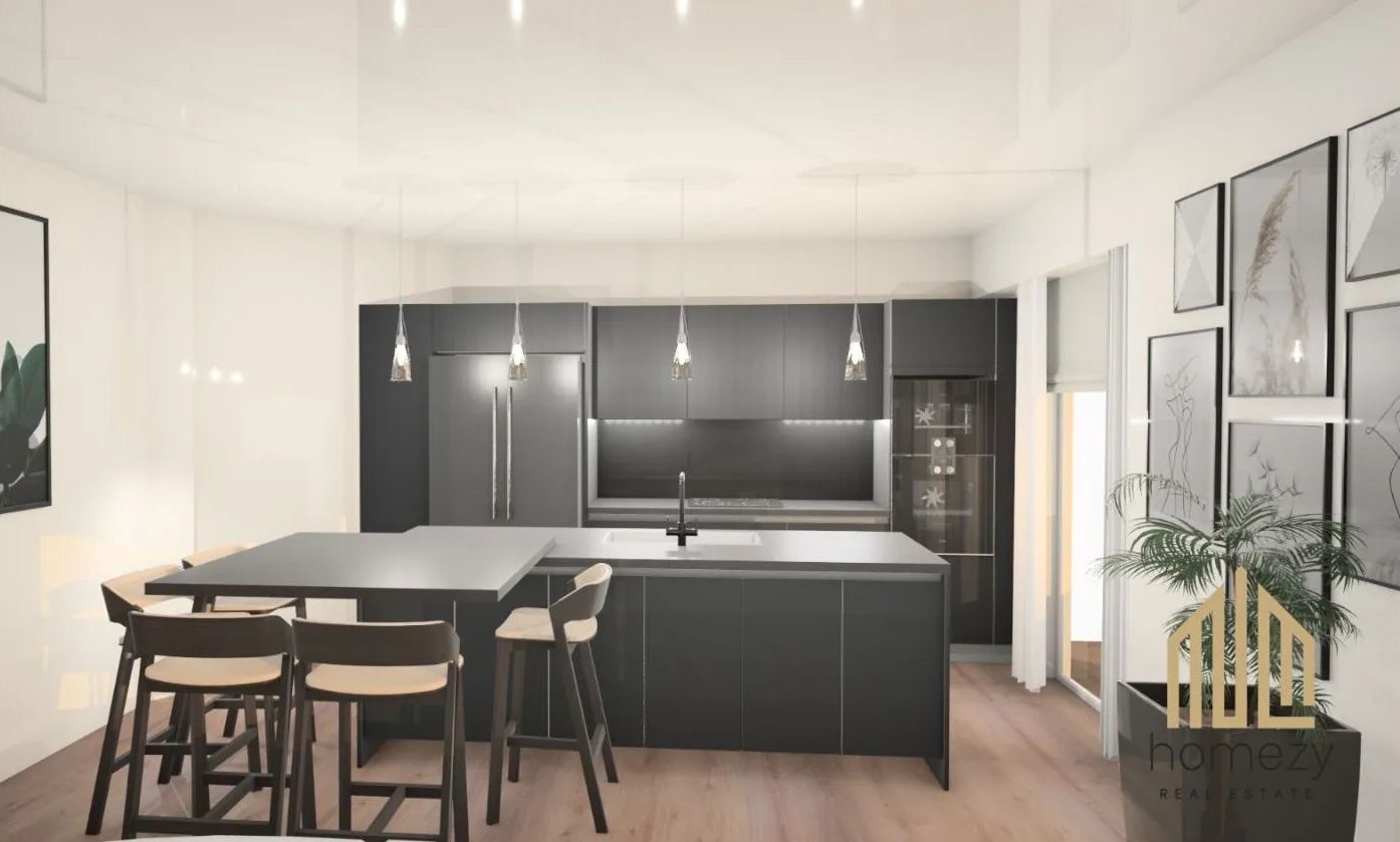Το οροφοδιαμέρισμα διαθέτει open-plan καθιστικό και κουζίνα υψηλής αισθητικής, με μίνιμαλ σχεδιασμό και εντυπωσιακή νησίδα. Η προσεγμένη επιλογή δαπέδων με πλακάκι απομίμησης ξύλου ενισχύει τη ζεστή αλλά σύγχρονη ατμόσφαιρα του χώρου.